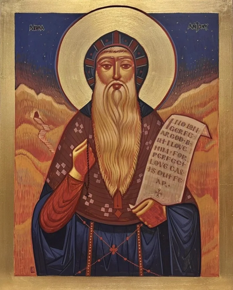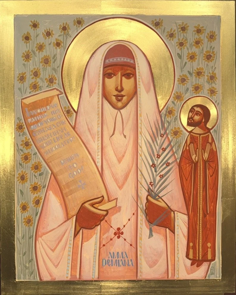 Here St Demiana is depicted as an abbess of convent. Her attire resembles that of a bride, as she is often—as all nuns are—described as the “bride of Christ.” In her vocation she encounters the mystery of the union between God and His Church, and interestingly she shares a feast date with the celebration of the wedding of Cana. St Demiana is expressed to us as a force of accountability in her veneration- to her father, to her friends, to her community. She becomes an icon of the Church, loyal to her Groom, a conqueror in suffering, and a celebrated victor with the palm branch she holds up to us. To the right is her father, who at some point in the narrative apostatizes but is brought back to the faith through a bold letter that his daughter sends to him: “I would have rather heard of your death as a Christian, living with Christ eternally, than your life as an idolator, dead in Hades. My father, return to Christ!” She holds this letter up for both him us, calling us to repent, abandon our idols, and to die in Christ. Behind her are forty sunflowers, her friends who all face the Son to bask in His light.