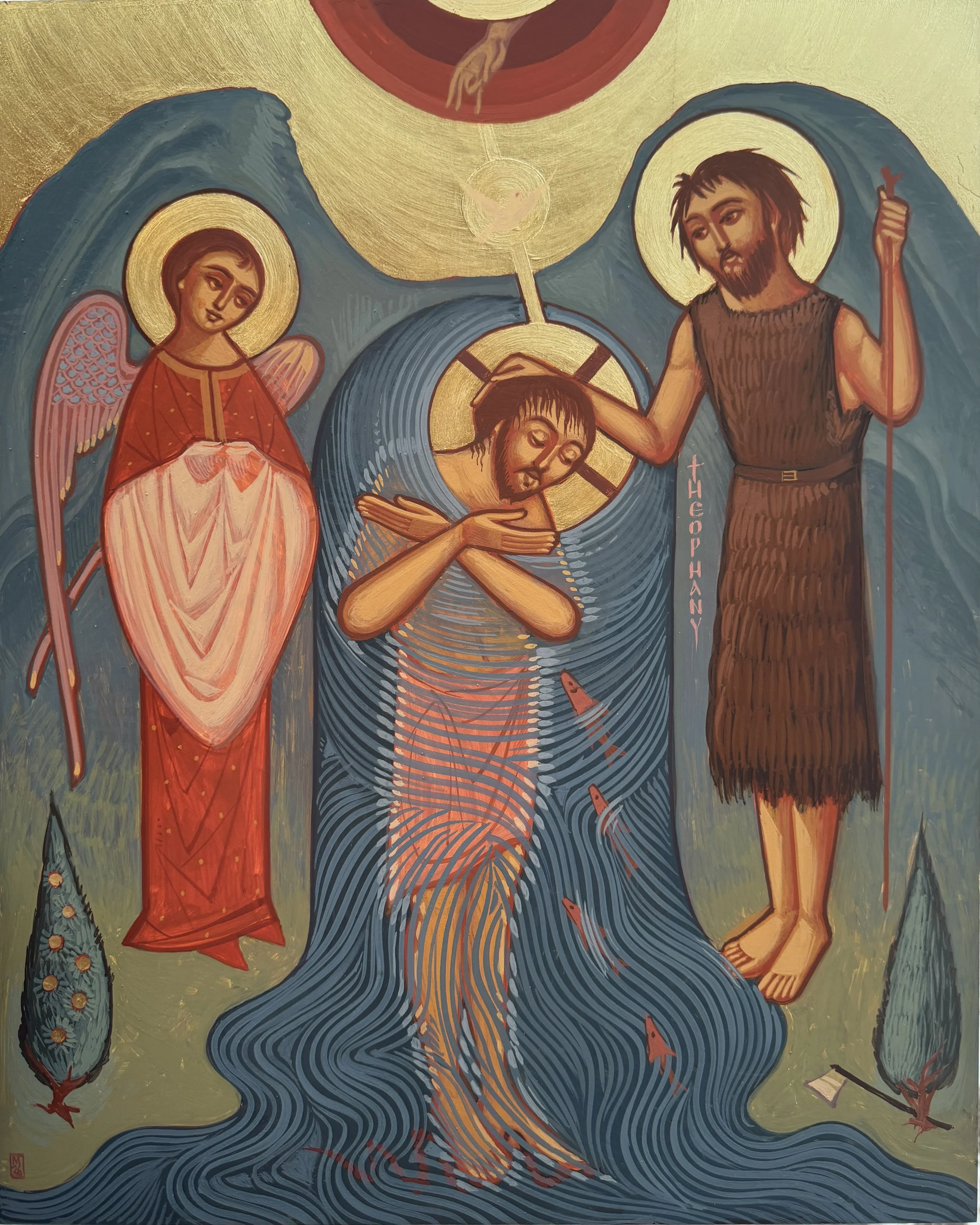 In this icon Immanuel, (God with us), is born of the Virgin, who presents Him to us. The Virgin and Child rest in a cave, and the Child is swaddled in linen, foreshadowing His burial. The Child, born to die, lays on what appears to be an altar, with the gifts of the magi- myrrh, gold, and frankincense. The viewer, too, is invited to offer their gifts at the altar, to adore the Child, to receive the Offering. Mary, the new Eve, in bearing God, has become heaven, and God who “rests in His saints” lies in a field of deep blue adorned with stars, Heaven has been brought to us, in the heart of the earth. With her red-earth veil she clothes the Divine with humanity. All of creation responds to the glorious birth, the earth offers a cave, the soil blooms and Paradise springs, the sun, moon, stars, and skies, the birds and animals—all flock around— creation is made anew. The ox and donkey lean forward towards the Saviour, “The ox knows its owner, and the donkey its master’s crib” (Isaiah 1:3). The shepherds and magi are guided by the angels over the mountainous terrain. The mountain meets heaven at the head of the Virgin, Heaven and earth are bound in the incarnation of God. -